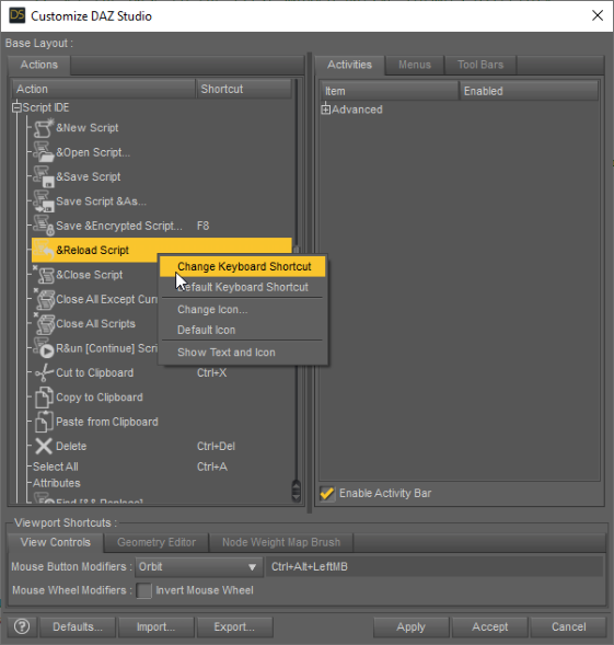 "Customize DAZ Studio" window (Window > Workspace > Customize (or press F3)) and find the Script