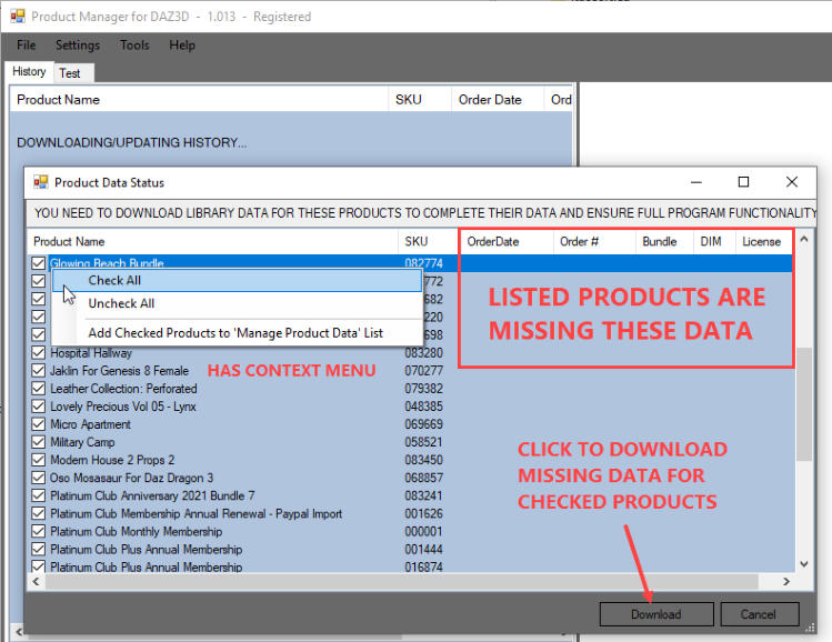 ‘Manage Product Data’ List as well as Add Checked Products to Download List from the context